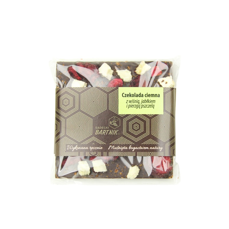 Składniki: czekolada 89,3%, wiśnie liofilizowane 4,2%, jabłka liofilizowane 4,2%, pierzga pszczela mielona 2,3%. Masa kakaowa w czekoladzie min. 60%