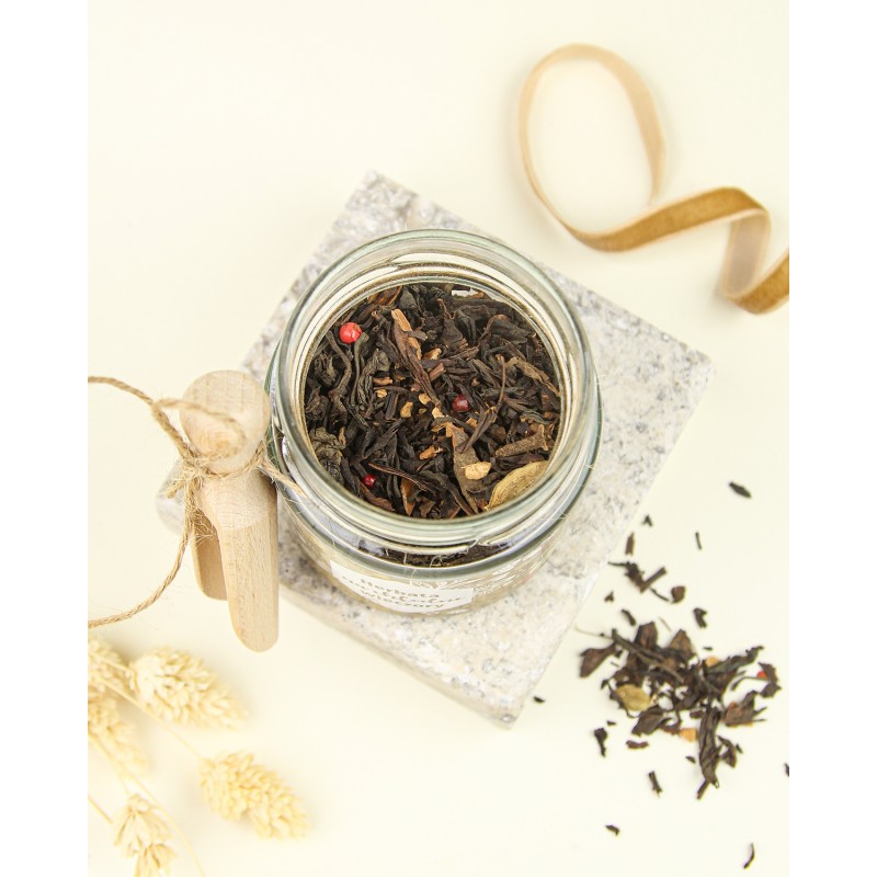 Składniki herbaty: Herbata Cejlon, imbir, cynamon, anyż, kardamon, goździki, pieprz, gałka muszkatołowa