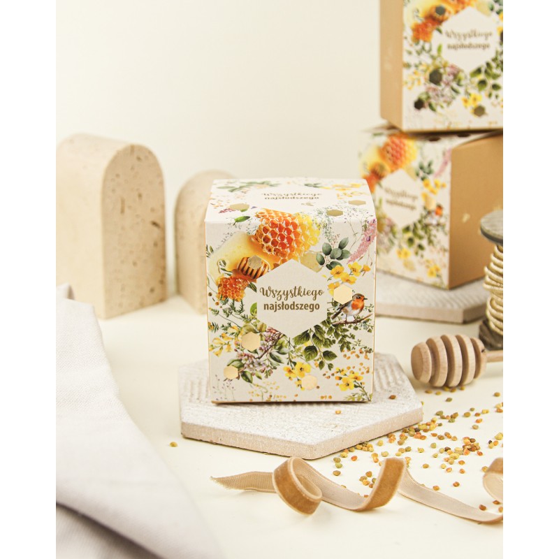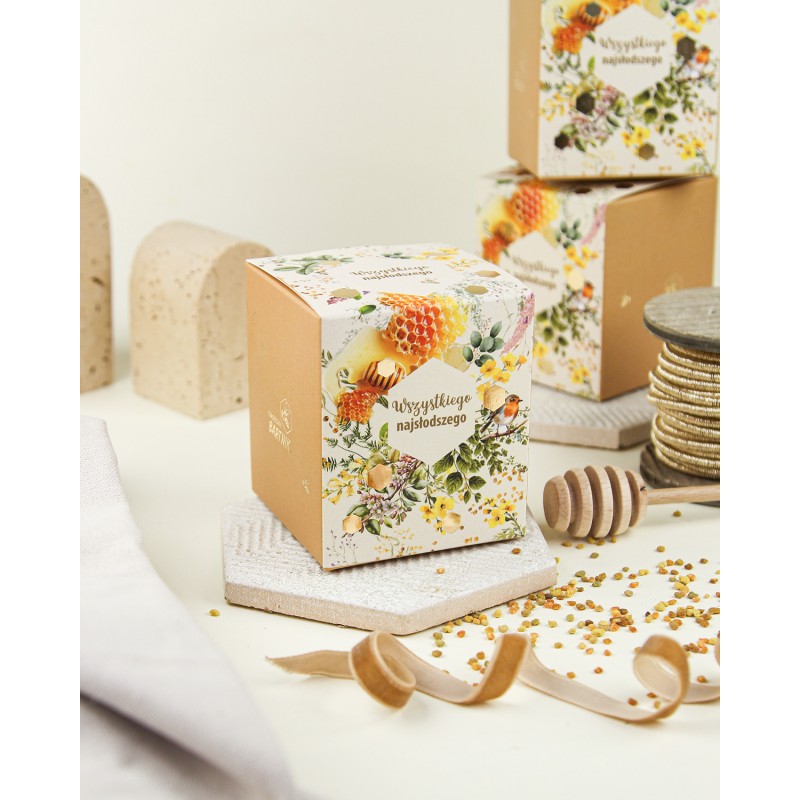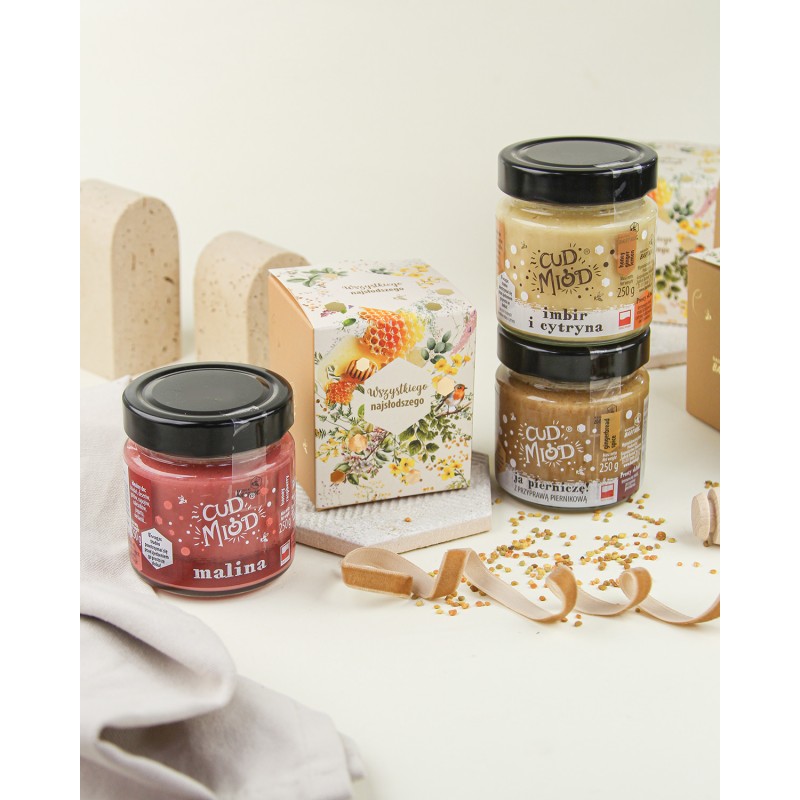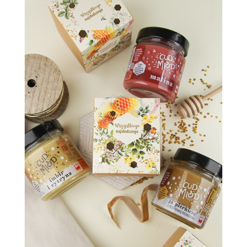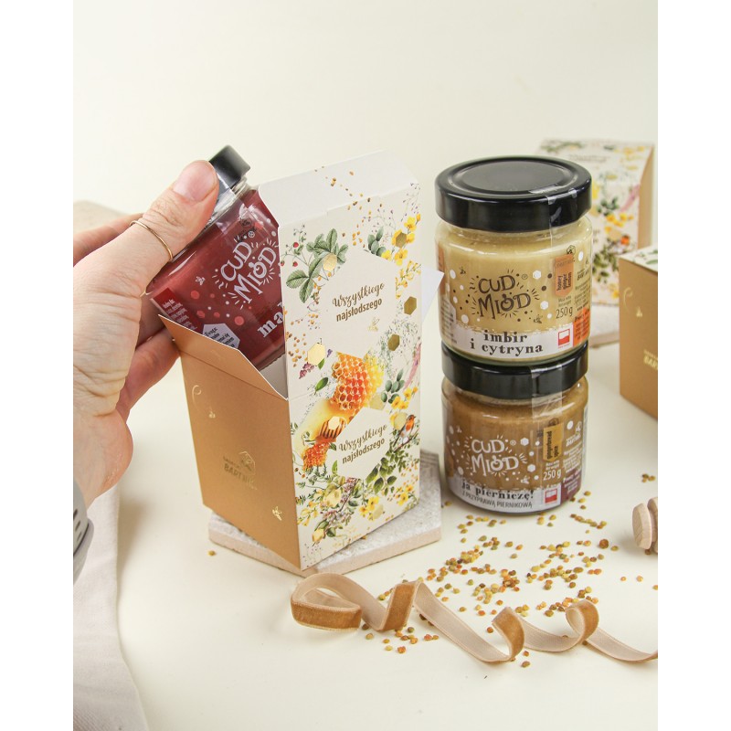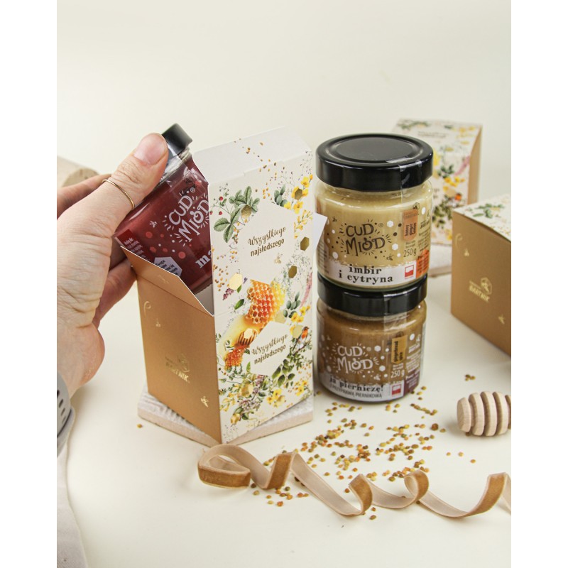Jeden cud miód, zamknięty w eleganckim kartoniku z wyjątkową grafiką i pięknymi, głębokimi złoceniami – zestaw* ten zachwyca nie tylko wyglądem, ale też zawartością. To stylowa, całoroczna propozycja prezentowa, która sprawdzi się przy wielu okazjach. Do wyboru masz szeroką gamę miodów z naturalnymi dodatkami, które zaskakują smakiem i właściwościami.