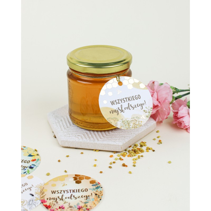 Miód wielokwiatowy 250 g z zawieszką, ozdobiony elegancką złotą gumeczką, to naturalny i stylowy prezent pełen słodyczy.